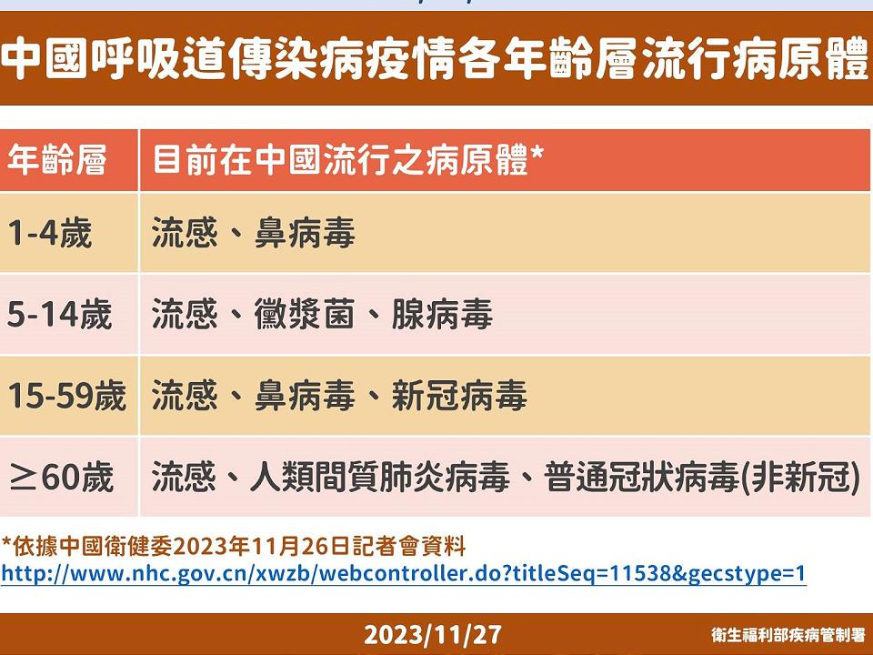 目前中國呼吸道感染疾病各年齡層病原體。翻攝衛服部