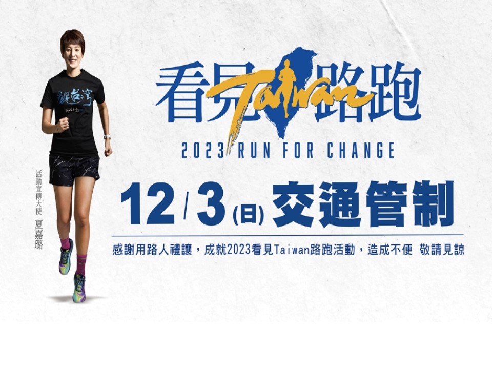 「2023看見Taiwan路跑」活動12月3日(日) 5時至10時,在台北市民廣場舉行,由齊柏林基金會主辦的路跑活動,分為21公里組與10公里組,起點在市民廣場,終點在大佳河濱公園,為維護交通秩序與活動安全,台北市警察局將實施交通管制,禁止車輛通行。