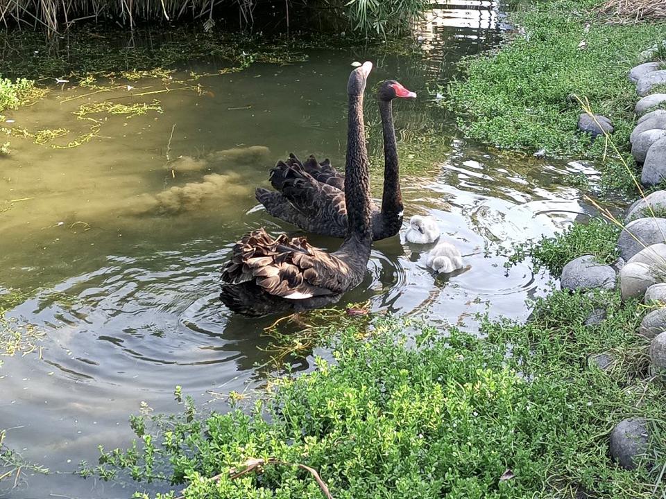 台中市秋紅谷景觀生態公園2對黑天鵝11月再添6隻鵝寶寶,喜獲麟「鵝」,吸引許多市民朋友前往觀看,毛茸茸的鵝寶寶在湖面游來游去相當可愛,吸引許多人駐足拍照。台中市建設局長陳大田提醒,請民眾勿跨越欄杆驚擾黑天鵝及鵝寶寶,也勿餵食,讓黑天鵝家族開心生活。