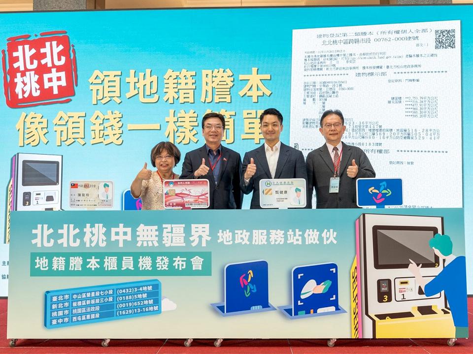 台北市、新北市、桃園市、台中市28日聯合發布「北北桃中無疆界 地政服務站做伙-地籍謄本櫃員機聯發跨縣市謄本發布會」,民眾只要用自然人憑證、健保卡、身分證驗證,就能利用地籍謄本櫃員機自行操作,跨縣市請領地籍謄本,就和用ATM領錢一樣簡單。